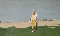 Focusing entirely on the figure, Ms. Coulis, Mr. Fisher, and Mr. Howard demonstrate complex psychological relationships between the characters who inhabit their paintings. Ridley Howard's delicately rendered images show numerous encounters between men and women that seem like the daydreams of F. Scott Fitzgerald characters. A Manhattan Housing Authority complex across the East River in Famous Riverside View provides an expansive panorama for a young couple so that they may share a rare peaceful moment amidst the clamor of an otherwise kinetic city. Their beguilement by the obstinate buildings is understandable given the disarmingly lovely way in which the complex is depicted. Howard's paintings of boundless cityscapes trick the viewer into thinking they are of Dick and Nicole Diver's French Riviera* instead of the New York City that provides the inspiration for them.